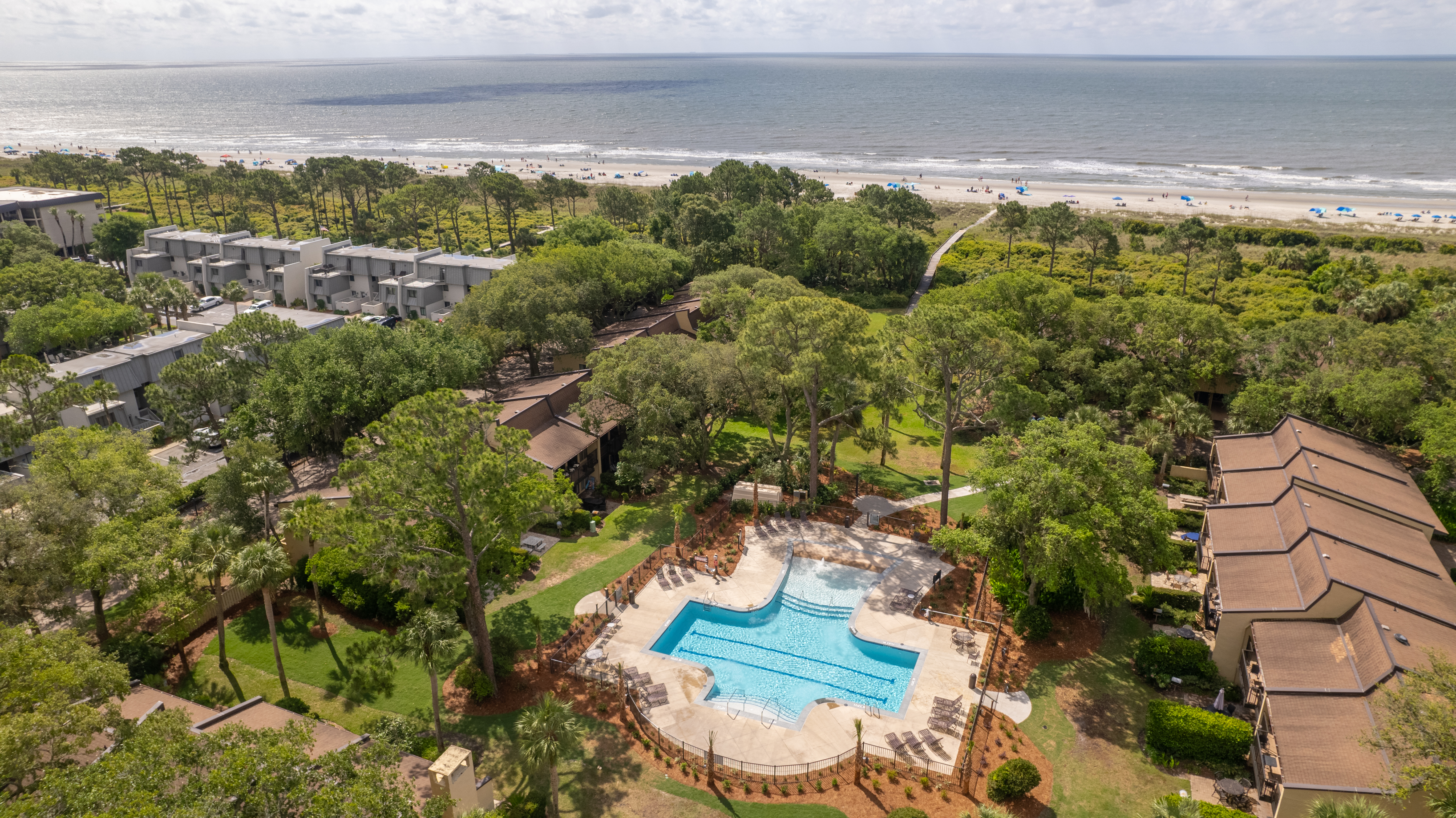 Loved this condo in a snall complex of only 30. Our condo faced the ocean and was only steps from the pool. Lovely balcony for upper level abd patio with BBQ on lower. Level. Comfortable beds,well stocked kitchen. Short walk to private beach path. We saw deer, rabbits, numerous birds. Litm. A private oasis but close to everything on the island. Would recommend