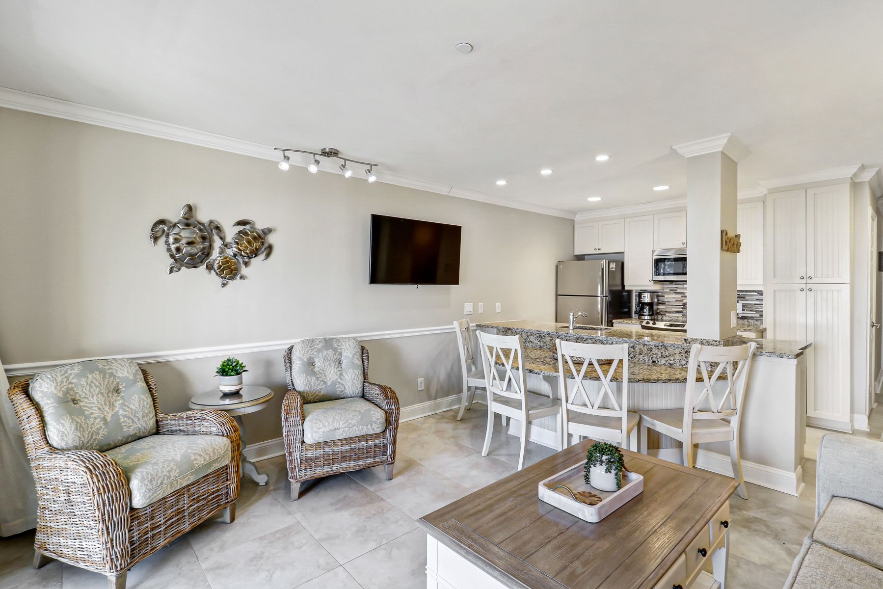 This was our first time in this unit and we were overjoyed by the newness of it all. Fresh paint, new furniture, lovely neutral colors, great comfy bed. I loved the dishes. This unit has a table and lamps on both sides of the bed a real treat for us "reading in bed at night" people. Great job in renovating. We. Made reservations for next year and can hardly wait. A small suggestion if I may. A fan in the front room, a mirror in the bedroom and a hat rack or hooks on wall by door. We'd still stay there, but that would complete it. We have been coming to Hilton Head since 2008, our go to place for R & R. Ocean Dunes is great.